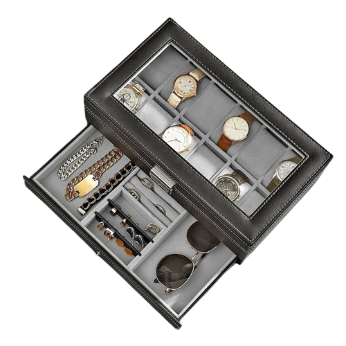 El cuero PU negro exterior y el interior de gamuza/terciopelo gris crean una combinación elegante que se ve increíble en cualquier vestidor. La tapa de vidrio permite admirar tus relojes sin abrir la caja, mientras el cajón mantiene tus joyas organizadas y libres de polvo.