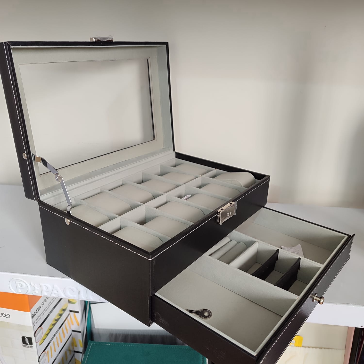 La solución todo-en-uno para tu colección. Esta elegante caja multiuso cuenta con doble compartimiento: nivel superior para relojes con tapa de vidrio y cajón inferior para joyas y lentes. Fabricada en cuero PU negro premium con interior de gamuza/terciopelo gris para máxima protección. Incluye sistema de seguridad con llave. Todo tu arsenal de accesorios en un solo lugar.