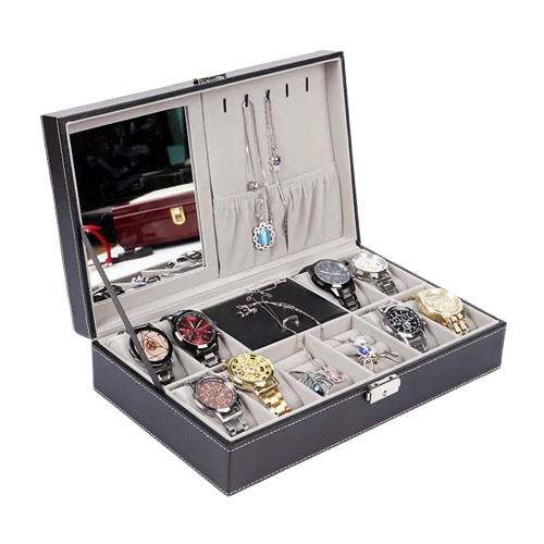 8 RELOJES + JOYERO & ESPEJO¿Cansado de buscar tus accesorios cada mañana? Eleva la categoría de tu colección con nuestro estuche híbrido. Diseñado para el hombre y la mujer moderna que valoran el orden y la elegancia.